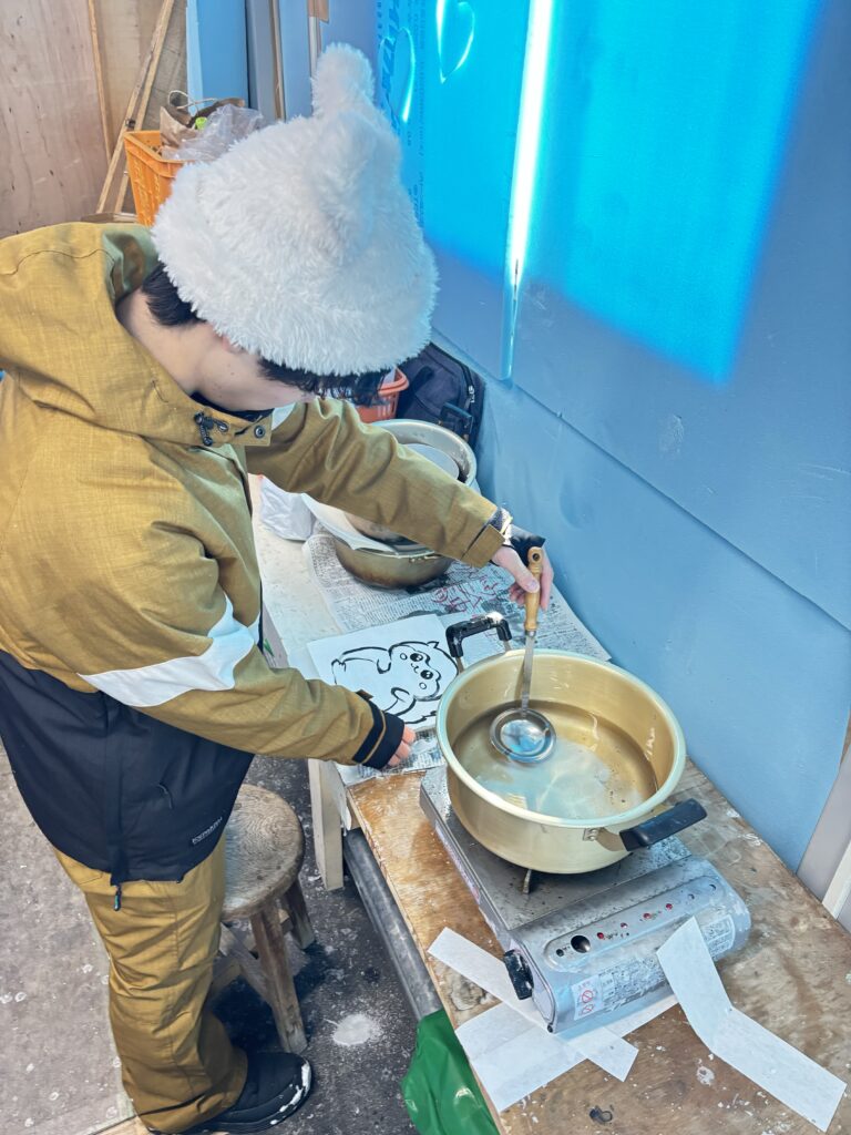 溶かして成形したロウに半紙で書いた「情熱クラブ」の文字を当てはめてロウ板を作製しました。 こちらのロウはイベントで使用後のロウソクを回収し、再利用して使われています。